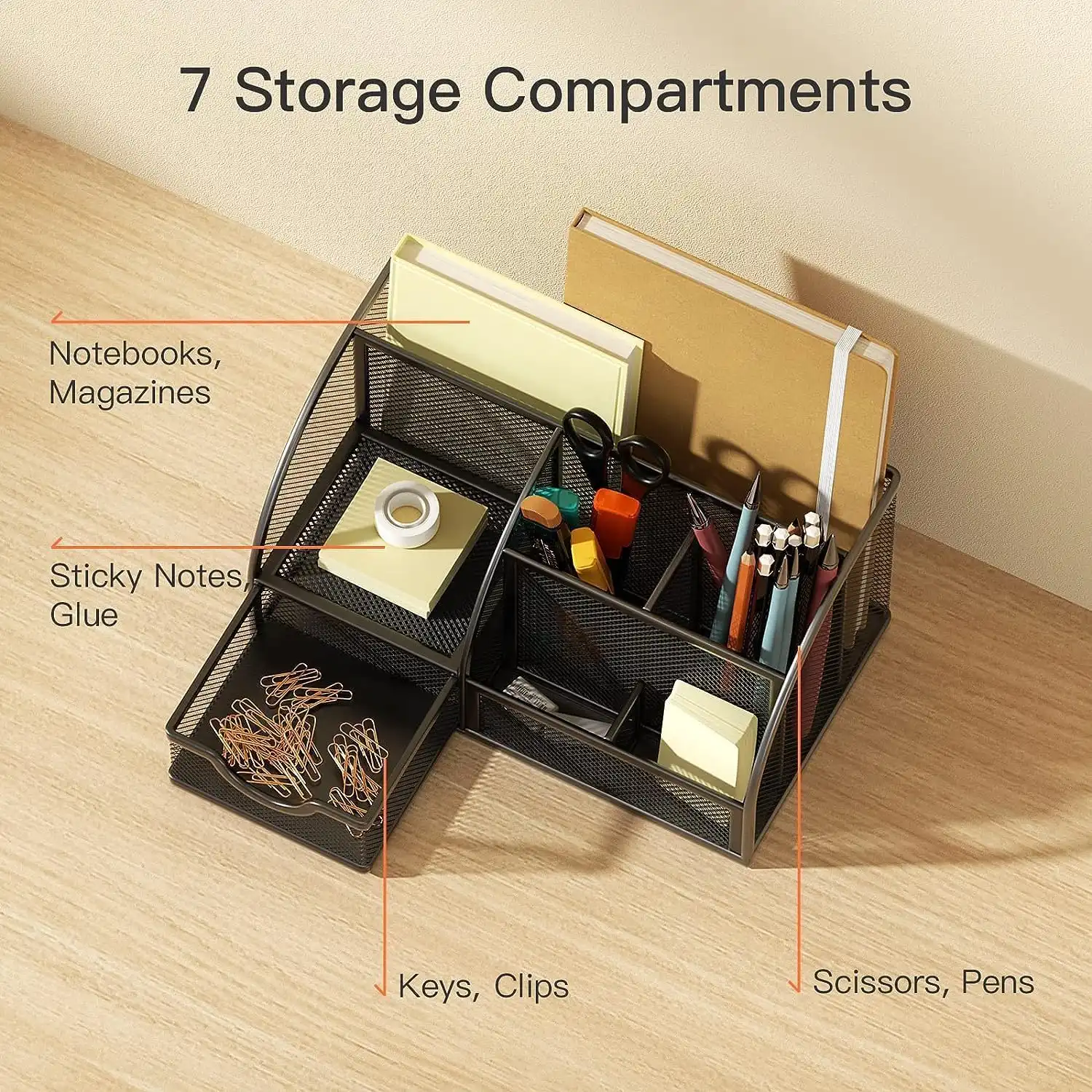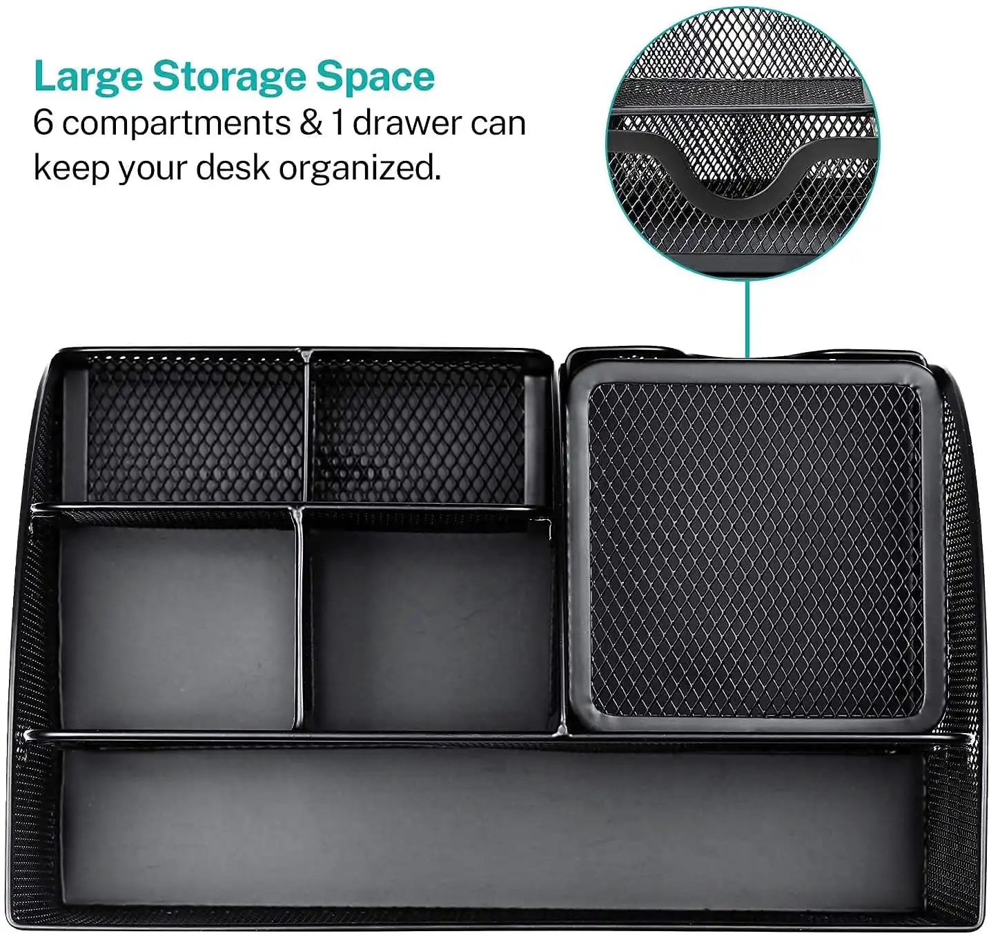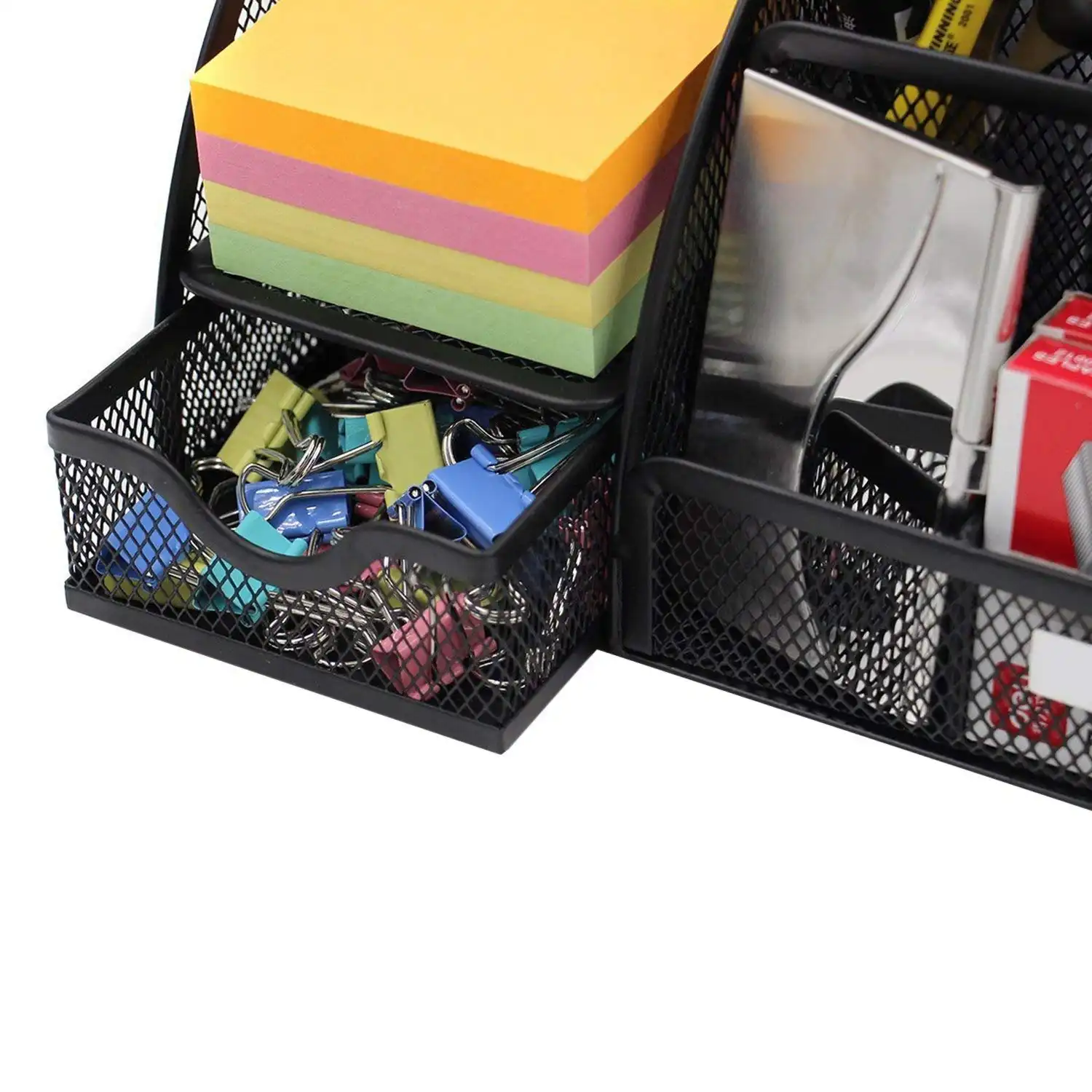 Storage pullout drawer and accessory holder create spaces for storing staplers, erasers, pens, memos, clips, highlighters, tacks, keys, other small accessories and within easy reach.Package Contains : 1 Metal Mesh Desk Organizer